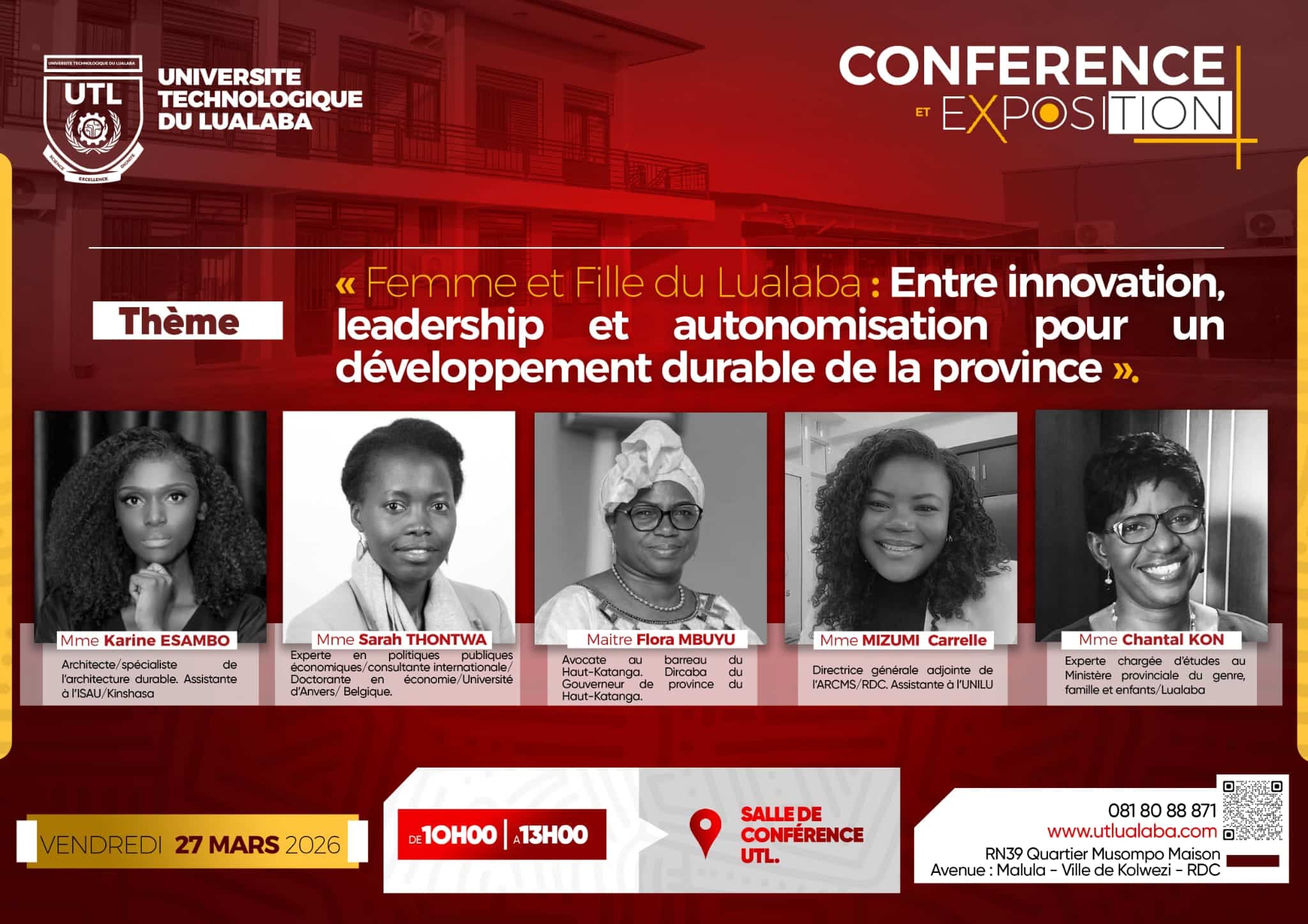 A l’occasion de la clôture des activités liées au mois de la femme, l’ Université Technologique du Lualaba organise une conférence qui réunira des intervenantes inspirantes autour du thème : « Femme et Fille du Lualaba: Entre innovation, leadership et autonomisation pour un développement durable de la province »